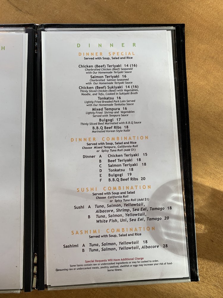 BBQ beef ribs. Served with soup, salad, and rice. You can chhose from mixed tempura or california roll or spicy tuna roll(add $.)
